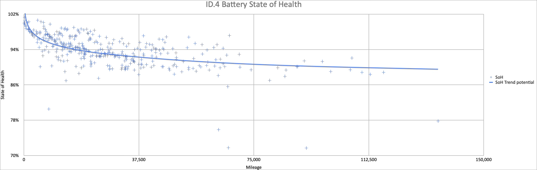 ID.4-specific data from the vwidtalk.com SOH tracking spreadsheet, maintained by the community. Thanks to the 100+ owners who contributed their scan results.